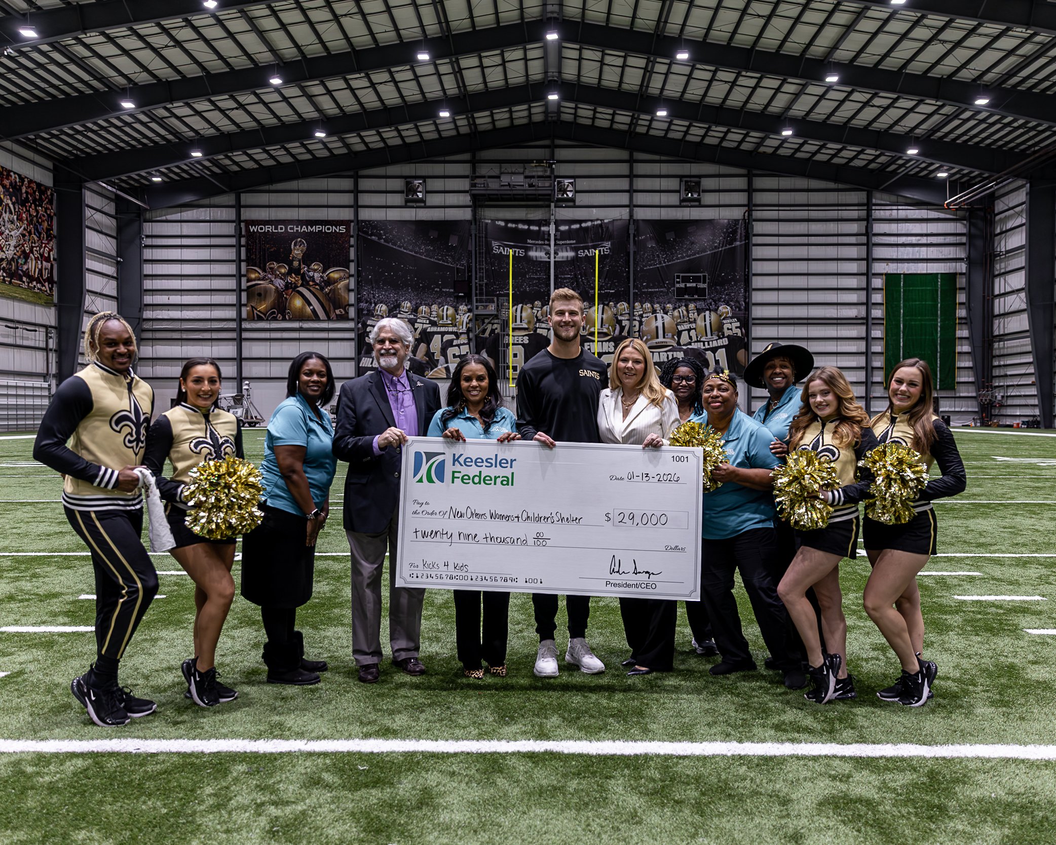 Keesler Federal Credit Union presented a $29,000 donation to the New Orleans Women & Children’s Shelter as part of the Saints Kicks for Kids program, recognizing on-field success during the 2025 New Orleans Saints season while supporting critical community initiatives.